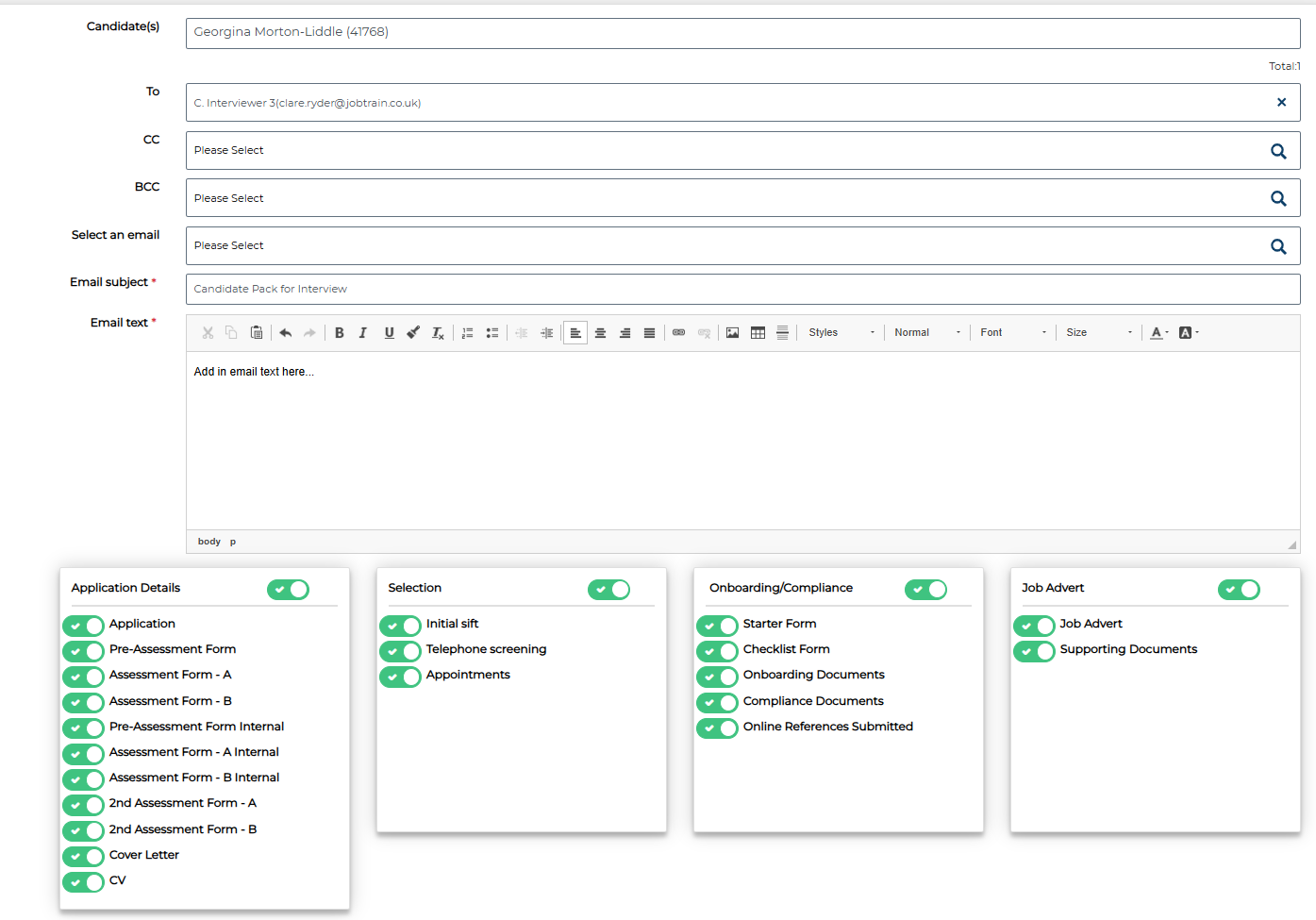 Then select which forms and documents from the candidate record you wish to forward using the toggle switches adjacent to each.