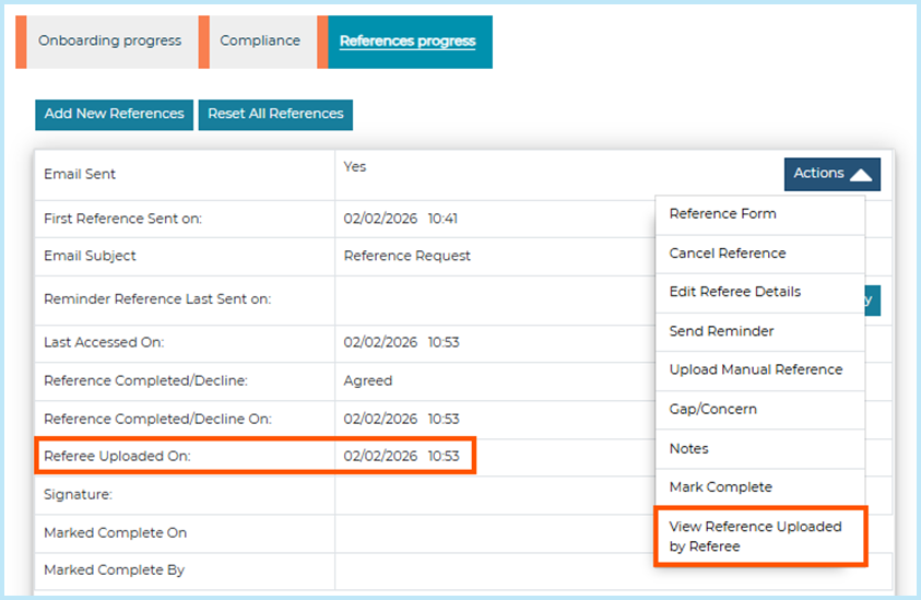 You can see whether a reference was completed via the online form, uploaded by the referee or added manually using icons in the Onboarding Hub and details in the candidate record.